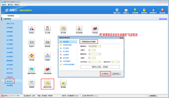 在功能導航窗點擊“基礎資料”—》“編碼規(guī)則設置”打開基礎資料編碼規(guī)則界面,將“新增商品自動生成編碼”勾選取消,然后保存編碼規(guī)則設置。
