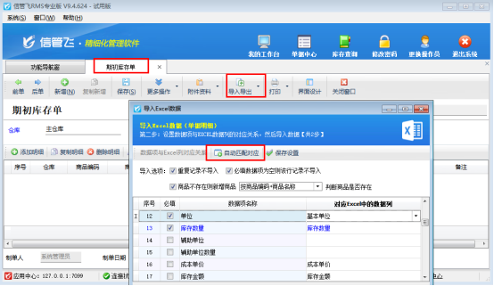 客戶端程序選擇新賬套登錄軟件,新賬套為“未啟用”狀態(tài),功能導(dǎo)航窗點(diǎn)擊“基礎(chǔ)資料”—“期初建賬”,打開“期初庫存錄入”界面。選擇倉庫界面新增“倉庫”并選擇后,點(diǎn)擊工具欄“導(dǎo)入導(dǎo)出”按鈕下的“從Excel導(dǎo)入明細(xì)”,通過復(fù)制導(dǎo)出的Excel文件內(nèi)容,粘貼進(jìn)行導(dǎo)入數(shù)據(jù),下一步對應(yīng)下數(shù)據(jù)項(xiàng)。如下圖所示:
