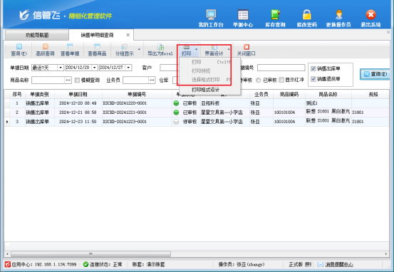 進(jìn)銷存管理軟件、信管飛倉庫管理軟件、信管飛送貨單軟件、信管飛出納記賬軟件等軟件內(nèi)都提供的有打印預(yù)覽及打印功能,可以打印銷售單、對(duì)賬單及各類統(tǒng)計(jì)報(bào)表。然而,有用戶反映,在銷售單明細(xì)查詢界面,他們希望無需操作員手動(dòng)執(zhí)行打印操作。針對(duì)這一需求,本篇文章以“信管飛RMS軟件”為例介紹下如何解決?