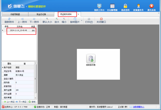 信管飛出納記賬軟件在新增或修改憑證時,允許用戶添加文檔、圖表等豐富的附件資料,支持掃描或直接導(dǎo)入與出納憑證相關(guān)的電子文件。這一功能極大地方便了用戶全面、直觀地回溯和查詢?nèi)沼涃~憑證的詳細信息,有效提升了企業(yè)對日記賬憑證的管理效率。當用戶需要在日記賬列表界面快速查看某一憑證的附件時,信管飛出納記賬軟件提供了直接在列表中打開附件資料的便捷功能。本文以“信管飛出納記賬軟件”為例介紹一下如何在日記賬列表界面輕松查看憑證附件?
