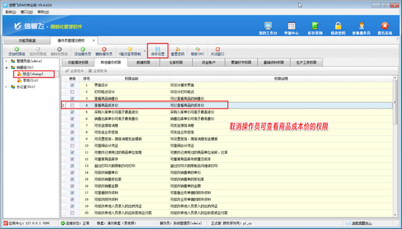 以信管飛RMS為例,軟件支持為多個操作員設置賬號,并詳細劃分權限。對于不希望員工查看的商品成本價格,設置過程簡單明了。只需在功能導航窗選擇“系統管理”進入“操作員及授權”界面,輕松取消對應賬號的“查看商品成本價”權限。