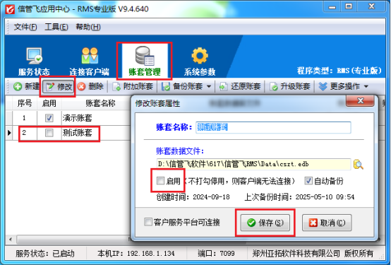 保存修改后,再次查看賬套列表,會(huì)發(fā)現(xiàn)該帳套的啟用對(duì)勾已經(jīng)取消,這表明該賬套已成功停用。為了確保設(shè)置生效,可以點(diǎn)擊“文件”—》“退出本程序”,先退出應(yīng)用中心,然后再重新運(yùn)行紅色應(yīng)用中心。
