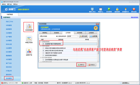 信管飛RMS軟件擁有完善的進出庫功能,同時支持采購銷售出入庫單據自動生成往來應收應付款功能。值得一提的是,在開出入庫單據時,它支持顯示當前往來單位的欠款情況。系統管理員用戶登錄軟件后只需在功能導航窗依次點擊“系統管理”—“系統參數配置”,在“業務參數”中勾選“在選擇客戶窗口可查詢應收款”這一參數,并保存設置。這一簡單的操作,為后續快速查詢賬款信息奠定了基礎。