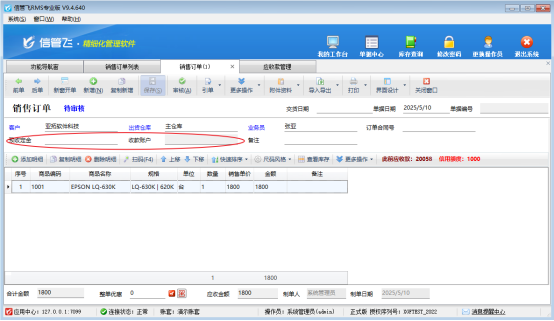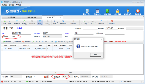 訂單中預(yù)收定金2000元,訂單應(yīng)收金額1800元,開單不能保存。