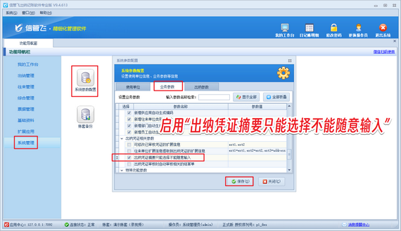 一鍵開啟規范模式:登錄軟件后,進入【系統管理】-【系統參數配置】-【業務參數】界面,只需勾選“出納憑證摘要只能選擇不能隨意輸入”選項并保存,即可完成基礎設置。系統支持管理員預設標準摘要庫,從源頭杜絕隨意填寫,確保每筆賬目都符合企業財務規范。