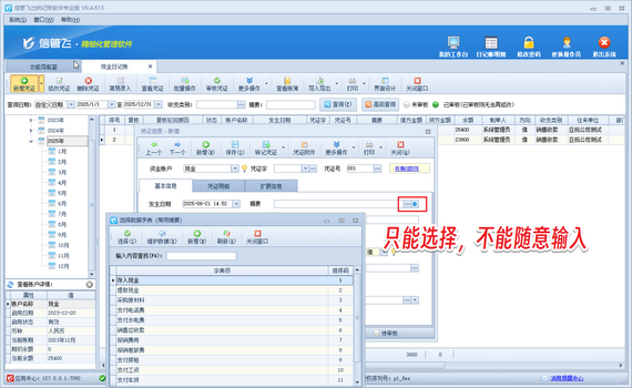 智能選擇提升效率:設置完成后,在【出納管理】模塊新增日記賬時,摘要欄將自動禁用手動輸入,用戶只需點擊右側“...”按鈕,即可從預設摘要庫中快速選取。標準化摘要不僅減少人為錯誤,更讓后續統計分析與審計核查事半功倍。