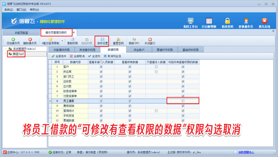使用系統管理員賬號登錄軟件,在功能導航窗點擊“系統管理”—》“操作員及授權”打開操作員管理及授權界面,選擇操作員賬號,在“數據權限”界面將員工借款“可修改有查看權限的數據”的權限勾選取消,然后保存權限設置,如下圖所示。