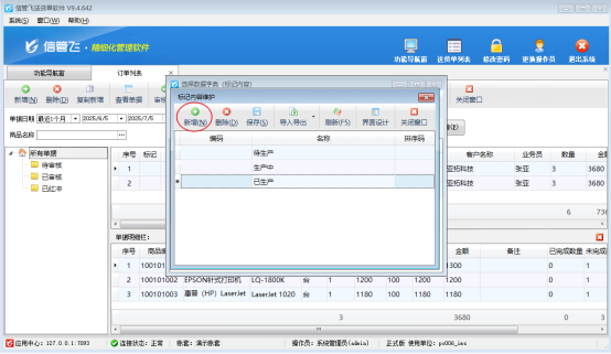 信管飛軟件支持對訂單列表、送貨單列表以及退貨單列表使用不同顏色旗幟標記備注,把標記常用內容可提前維護到數據字典中,方便標記時候直接選擇錄入,例如訂單列表,可以先把生產狀態維護在數據字典中,標記直接使用。本文示范下如何操作?