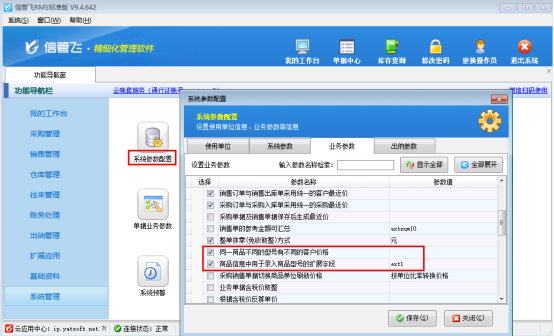 1.參數(shù)配置:進(jìn)入“系統(tǒng)管理”—“系統(tǒng)參數(shù)設(shè)置”—“業(yè)務(wù)參數(shù)”界面,勾選啟用“同一商品不同的型號有不同的客戶價(jià)格”參數(shù),同時(shí)設(shè)置“商品信息中用于錄入商品型號的擴(kuò)展字段”(默認(rèn)是“ext1(擴(kuò)展信息1)”),完成基礎(chǔ)設(shè)置。