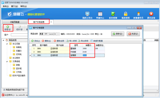 2.維護(hù)價(jià)格:在“基礎(chǔ)資料”的“客戶價(jià)格信息”界面,點(diǎn)擊“新增”—“按商品添加價(jià)格信息”,選擇目標(biāo)商品后,即可為不同型號分別設(shè)置對應(yīng)客戶的價(jià)格。比如“惠普(HP)LaserJet 1020”這款打印機(jī),可分別為“基礎(chǔ)版”“升級版”“至尊版”設(shè)置針對“亞拓科技”的不同銷售價(jià)。