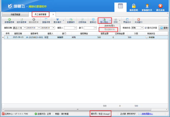 權(quán)限設(shè)置完成后,更換操作員“張亞”登錄軟件。打開“綜合管理”—》“員工借款管理”界面,此時(shí)“導(dǎo)出為 Excel”按鈕已變?yōu)榛疑珷顟B(tài),該操作員賬號(hào)已無(wú)法導(dǎo)出借款記錄。