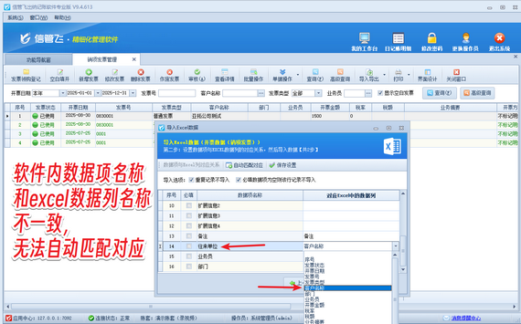 在企業的采購與銷售流程中,發票管理至關重要。信管飛出納記賬軟件憑借其強大的發票管理功能,助力企業高效、精準地處理發票信息。另外,軟件支持導入Excel快速導入發票信息。有用戶在軟件內導出銷項發票Excel模版,維護數據后導入軟件,客戶名稱這一項導入不成功,如下圖所示。