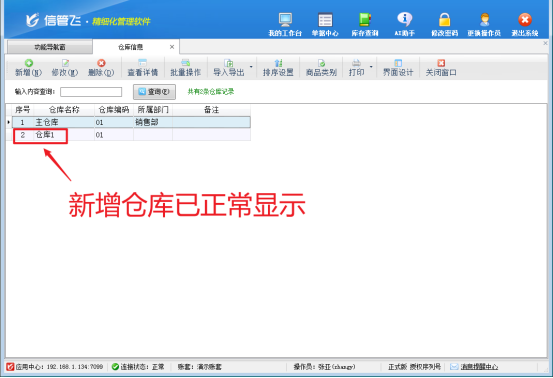 設(shè)置操作員權(quán)限后,使用操作員“張亞”重新登錄軟件,此時(shí)新增倉庫已正常顯示。