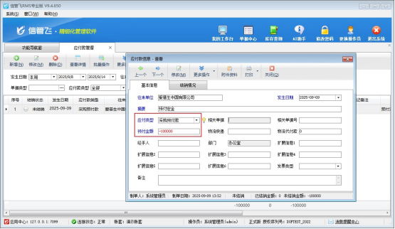 再回到應(yīng)付款管理界面,未結(jié)銷的采購預(yù)付款的結(jié)銷狀態(tài)更新為部分結(jié)銷,并且未結(jié)銷金額是-50000元,該筆采購預(yù)付款可用于后續(xù)采購應(yīng)付款金額進(jìn)行抵消結(jié)算。