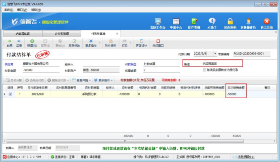 在付款結(jié)算單界面單獨(dú)結(jié)算這一筆采購預(yù)付款的賬單,付款金額錄入-50000元,可以在備注項(xiàng)錄入供應(yīng)商退回以便后續(xù)查詢,如下圖所示: