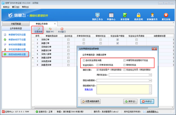 微信消息服務是信管飛軟件基于微信開放平臺研發的業務消息發送服務,支持即時推送業務單據消息,如訂單通知、發貨信息等。支持客戶查看消息詳情(可配置外部查看數據項)、單據簽收確認、分享轉發等功能。 推送微信消息接收人員支持推送給業務員、客戶,系統內支持邀請業務員及客戶綁定微信賬號,業務員及客戶綁定微信賬號后,在軟件內開單時即可對業