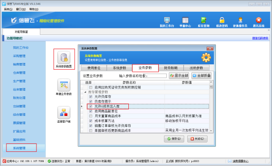 信管飛RMS軟件、信管飛倉庫管理軟件支持商品在有成本的情況下正常出入庫,也有部分客戶需要設(shè)置商品在成本為0的情況下允許商品出庫,如何設(shè)置呢?本文以“信管飛RMS軟件”為例,介紹下如何設(shè)置允許商品0成本出入庫。 在功能導(dǎo)航窗點擊“系統(tǒng)管理”—》“系統(tǒng)參數(shù)配置”—》“業(yè)務(wù)參數(shù)”,進(jìn)入“業(yè)務(wù)參數(shù)”配置界面,