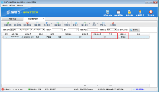 信管飛出納記賬軟件的員工借款管理及還款管理可以對企業(yè)員工借款、還款進(jìn)行流程化登記管理,提高了企業(yè)管理效率。員工借款后,如何直接在借款界面進(jìn)行還款核銷呢,本篇文章我們介紹一下員工借款之后如何在借款管理界面進(jìn)行還款核銷? 在功能導(dǎo)航窗點擊“綜合管理”—》“員工借款管理”即可進(jìn)入“員工借款管理”界面,在此界