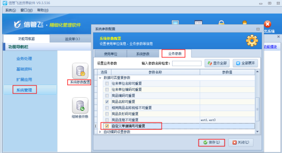 信管飛送貨單軟件支持設(shè)置商品擴(kuò)展數(shù)值提取到單據(jù)擴(kuò)展數(shù)值,啟用此參數(shù)后,在開單據(jù)時(shí)系統(tǒng)會(huì)自動(dòng)調(diào)取商品信息中的擴(kuò)展數(shù)值數(shù)據(jù),省去了每次開單錄入單據(jù)擴(kuò)展數(shù)值的時(shí)間,提高了開單效率。下面我們介紹一下具體的操作步驟。 在功能導(dǎo)航窗點(diǎn)擊“系統(tǒng)管理”—》“系統(tǒng)參數(shù)配置”—》“業(yè)務(wù)參數(shù)”打開業(yè)務(wù)參數(shù)配置界面,在“業(yè)務(wù)單據(jù)明細(xì)參數(shù)”內(nèi)啟用參數(shù)