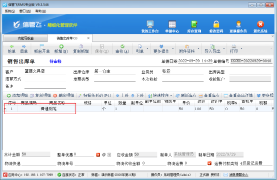 此文章相關(guān)演示視頻:如何設(shè)置新開送貨單時(shí)添加商品后自動(dòng)增加新行演示視頻 信管飛RMS軟件、信管飛倉庫管理軟件、信管飛送貨單軟件等都支持開單直接添加商品明細(xì),部分用戶在剛開始使用軟件時(shí),開單添加一個(gè)商品后,不清楚如何在單據(jù)明細(xì)內(nèi)繼續(xù)增加新的商品信息,如下圖所示,此問題在鍵盤上面按方向下鍵即可在單據(jù)明細(xì)中