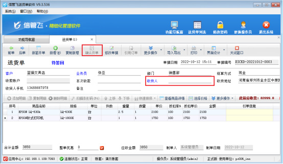 信管飛送貨單軟件、信管飛rms、信管飛倉庫管理軟件等支持開銷售單錄入收貨人信息,便于查詢單據(jù)商品是哪位客戶收到的貨物。也有客戶不需要開單時(shí)候輸入收貨人,對(duì)于不需要錄入收貨人信息的需求,軟件設(shè)置是否為必填項(xiàng)來進(jìn)行控制收貨人是否為空顯示。 以送貨單軟件為例,示范下如何設(shè)置開單收貨人允許為空。送貨單界面設(shè)置收貨人是必填項(xiàng)