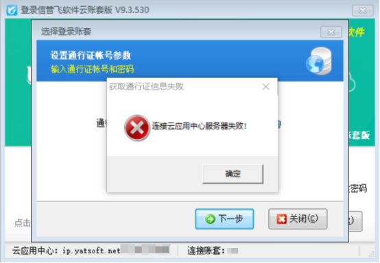 演示視頻觀看鏈接: 云賬套登錄提示“連接云應(yīng)用中心服務(wù)器失敗!”,如何解決演示視頻 部分用戶在登錄云賬套時(shí)可能會(huì)出現(xiàn)登錄不成功,彈出如下“連接云應(yīng)用中心服務(wù)器失敗!”的提示: 出現(xiàn)此種提示一般是