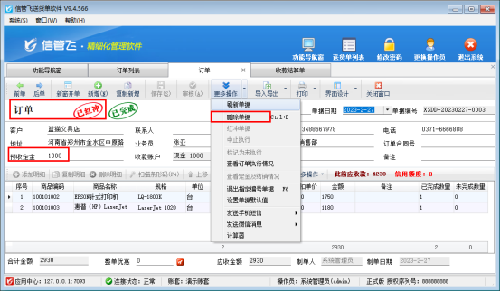 演示視頻觀看鏈接:送貨單軟件如何刪除已完成的訂單演示視頻 信管飛送貨單軟件可以先開訂單,然后實際開送貨單引單進行發(fā)貨,有用戶使用中需要刪除已完成狀態(tài)的訂單,如何進行刪除操作?本文示范下。 已完成狀態(tài)的訂單分兩種:1、無定金;2、有定金。 &nb