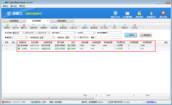 演示視頻觀看鏈接:客戶預(yù)付款部分沖銷銷售應(yīng)收款,如何開(kāi)收款結(jié)算單演示視頻 客戶預(yù)付款是客戶提前預(yù)付給我們的金額,可以用來(lái)沖銷銷售產(chǎn)生的應(yīng)收款,本文以信管飛出納記賬軟件為例演示一下客戶預(yù)付款部分沖銷銷售應(yīng)收款,如何開(kāi)收款結(jié)算單? 在功能導(dǎo)航窗點(diǎn)擊“往來(lái)管理”—》“應(yīng)收款管理”打開(kāi)應(yīng)收款管理界面,如下圖所