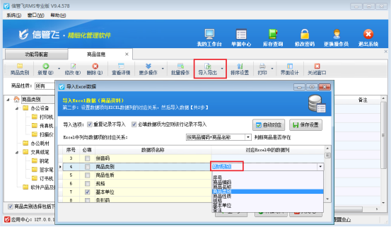 信管飛軟件支持通過Excel導(dǎo)入數(shù)據(jù),通過Excel數(shù)據(jù)導(dǎo)入可以將數(shù)據(jù)方便快捷的導(dǎo)入到軟件中,省去了使用初期大量的數(shù)據(jù)的錄入所要消耗的時間及人力物力,并避免人為錄入的誤差,使數(shù)據(jù)錄入的簡單、準(zhǔn)確、高效。下面我們以信管飛RMS軟件為例,示范下導(dǎo)入商品信息后,商品類別沒導(dǎo)入成功,如何解決? 方式一:刪除已