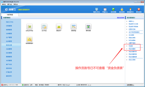 演示視頻觀看鏈接:信管飛RMS如何設(shè)置操作員不可查看資產(chǎn)負(fù)債表演示視頻 財務(wù)報表是財務(wù)報告的主要部分,是反映企業(yè)或預(yù)算單位一定時期資金、利潤狀況的會計報表。信管飛RMS專業(yè)版支持財務(wù)處理功能,可登記會計憑證,并支持生成財務(wù)報表,如資產(chǎn)負(fù)債表、利潤表、現(xiàn)金流量表等,如下圖所示。如果不希望員工賬號登錄后查看到這些報表,如何設(shè)置呢?本篇文章演