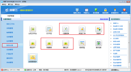 此文章相關(guān)演示視頻:專業(yè)版軟件如何顯示財務(wù)處理輔助單據(jù)演示視頻 信管飛RMS專業(yè)版軟件支持使用財務(wù)處理功能,部分用戶在使用最新版本軟件時,會發(fā)現(xiàn)財務(wù)處理功能沒有一般費(fèi)用單、其他收入單、調(diào)賬業(yè)務(wù)等功能,這是因為未勾選“顯示財務(wù)處理輔助單據(jù)”參數(shù)導(dǎo)致的,本文以“RMS專業(yè)版”為例介紹下如何顯示財務(wù)處理輔助