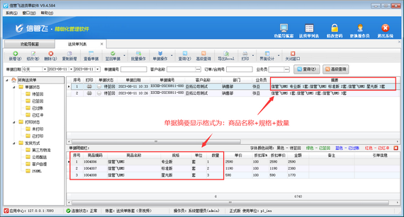演示視頻觀看鏈接:送貨單軟件如何設置單據(jù)摘要顯示格式演示視頻 送貨單確認開單后,系統(tǒng)可以自動生成送貨單摘要內(nèi)容,默認摘要顯示格式為“商品名稱 數(shù)量”,如下圖所示,同時系統(tǒng)也支持修改摘要顯示格式,本篇文章介紹一下送貨單軟件如何設置摘要顯示格式? 在功能導航窗點擊“系統(tǒng)管理”—》“系統(tǒng)參數(shù)設置