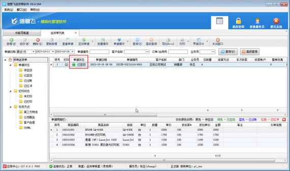 演示視頻觀看鏈接:操作員沒有簽回單據的權限,如何解決演示視頻 送貨單一般情況下是一式三聯(存根聯、客戶聯、回單聯),其中回單聯的作用是:在購買方收到商品核對完畢,與送貨單上的商品明細相符后,在回單聯上簽完名,由銷售方拿回,證明貨物已送達,買方確認已簽收。 信管飛送貨單軟件通過狀態控制實現簡