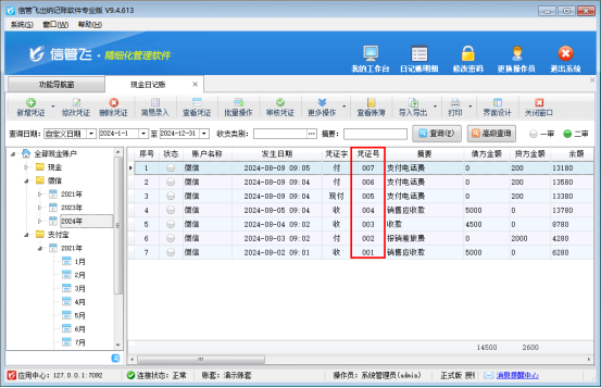 憑證號是出納憑證的重要標識,它記錄了每一筆經濟業務的唯一性,對于后續的賬務查詢分析至關重要。然而,在實際操作過程中,由于人為錯誤或系統調整等原因,可能會出現憑證號斷號的情況,這不僅影響了賬目的美觀性,還可能給后續的統計帶來困擾。信管飛出納軟件的日記賬檢查憑證號斷號功能,正是為了解決這一問題而生。問題如下圖所示:   &
