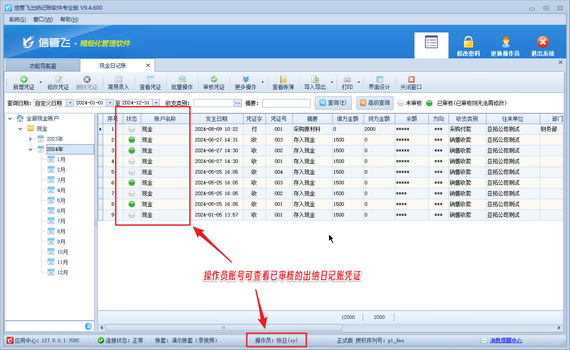 有用戶在使用信管飛出納記賬軟件時,系統管理員賬號登錄軟件可以查看已審核的出納日記賬憑證,但是操作員賬號登錄軟件無法查看已審核的出納日記賬憑證,如下圖所示。    演示視頻觀看鏈接:操作員不可查看已審核的出納日記賬憑證,如何解決演示視頻    出現以上問題的原因是:操作員賬號沒有查看已審核的出納日記賬憑