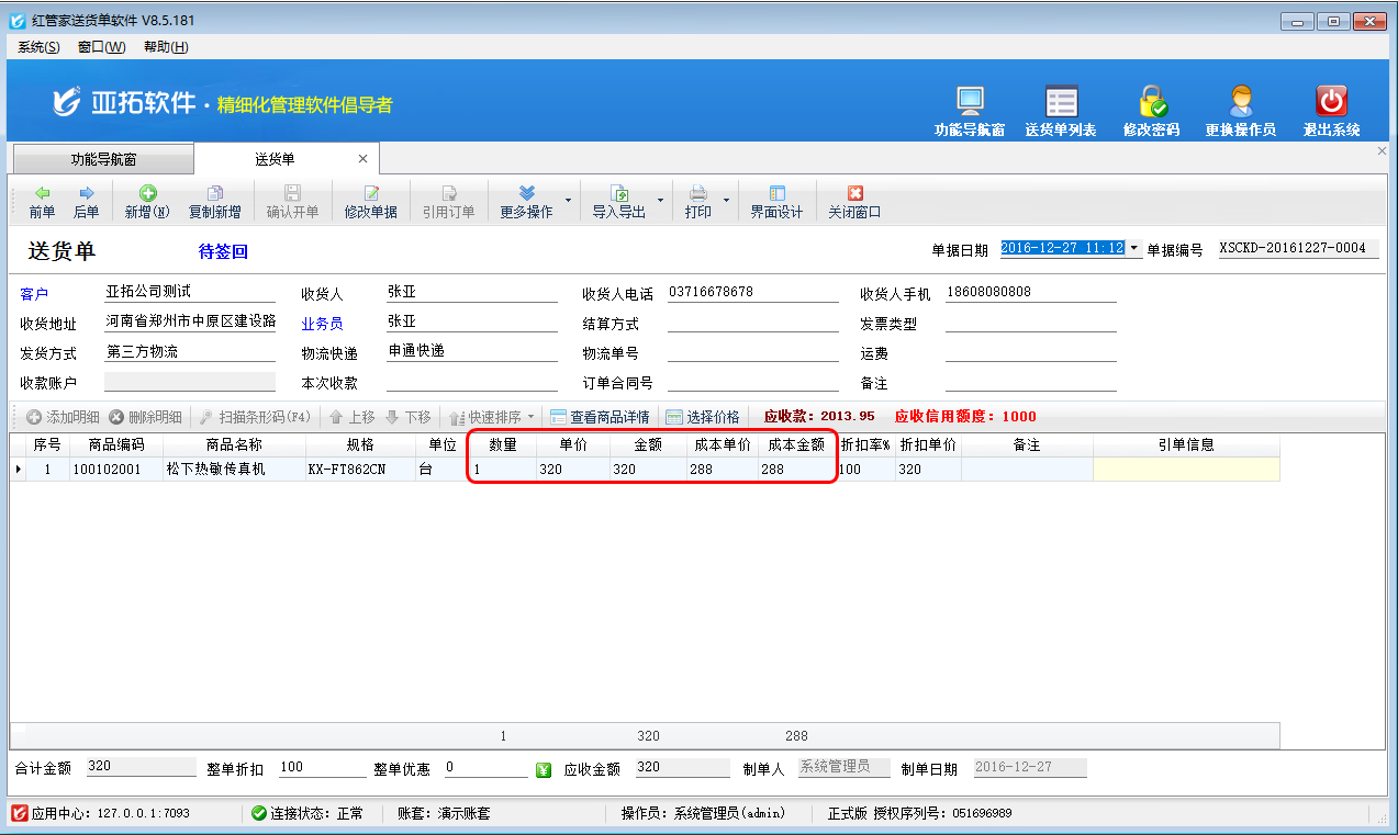紅管家送貨單打印軟件是一款針對中小型企業開發的集送貨管理(發貨管理)、退貨管理(銷售退貨)、銷售收款(應收款管理)等功能為一體的送貨管理及打印軟件(送貨單打印軟件、發貨單打印軟件、出貨單打印軟件、收據打印軟件、貨單票據打印軟件)。    商品成本是計算企業盈虧的依據,送貨單軟件內可以維護每個商品的成本價及統計每日、每月經營情況、銷
