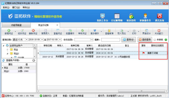 紅管家出納記賬軟件標準版、專業版中可對已開出的憑證進行復核駁回操作,對于有問題的憑證可標記駁回原因,可對原因進行分類以不同的顏色標記。     以出納記賬軟件專業版的現金日記賬為例,如何標記駁回原因。打開左側導航窗的“出納管理”,選擇“現金日記賬”中一個憑證(只有待審核的憑證才能被標記),點擊工具欄中的“更多