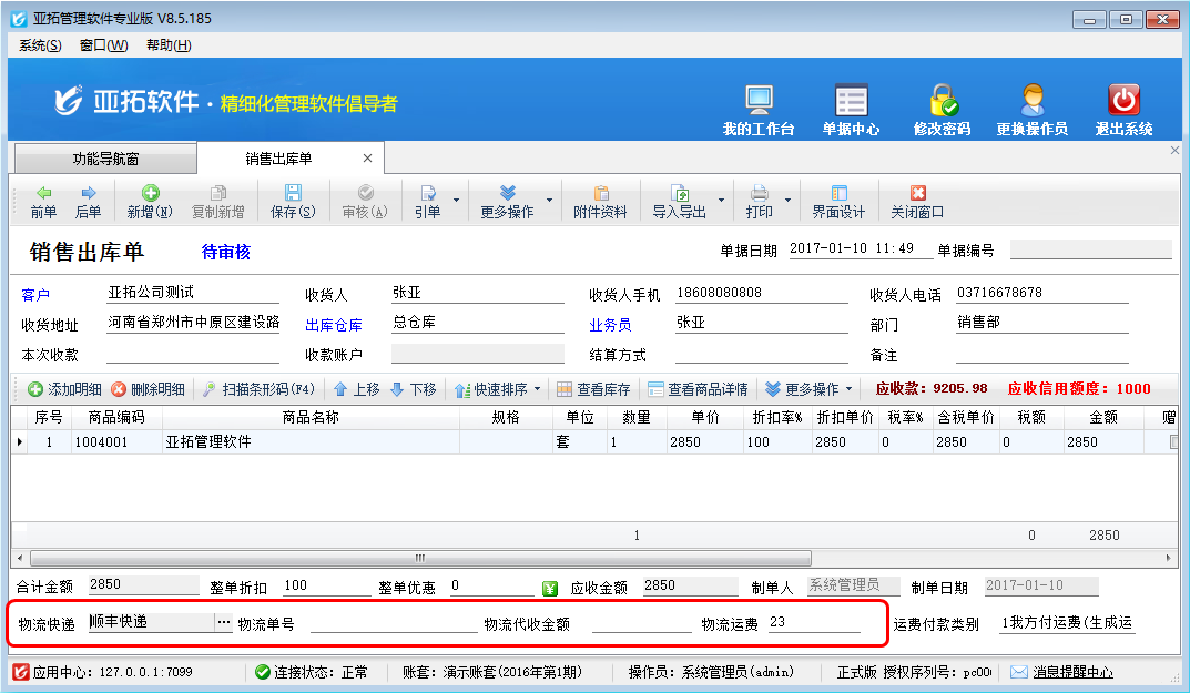 亞拓管理軟件標準版及專業版內都可以設置提取物流快遞數值(如運費)至單據指定的數據項內,本篇文章以亞拓管理軟件專業版為例介紹一下如何提取物流快遞運費至單據指定數據項內?一、維護物流快遞運費    在功能導航窗點擊“基礎資料”—》“物流快遞”打開物流快遞信息界面,修改“順豐快遞”運費為23元(可將物流快遞運費維護在“擴展數值(數據項英