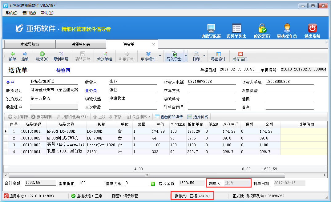 亞拓管理軟件、紅管家送貨單軟件、紅管家倉庫管理軟件、紅管家出納記賬軟件、紅管家票據(jù)打印軟件等安裝后默認(rèn)登陸的操作員為“系統(tǒng)管理員”,開單時(shí)“制單人”數(shù)據(jù)為當(dāng)前操作員名稱(即“系統(tǒng)管理員”),部分用戶在使用軟件時(shí)需要將其修改為其他名稱,在軟件內(nèi)如何修改呢?本篇文章以紅管家送貨單軟件為例詳細(xì)介紹一下如何修改“制單人”名稱?圖一