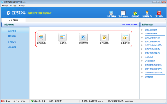 紅管家送貨單打印軟件是一款針對中小型企業開發的集送貨管理(發貨管理)、退貨管理(銷售退貨)、銷售收款(應收款管理)等功能為一體的送貨管理及打印軟件(送貨單打印軟件、發貨單打印軟件、出貨單打印軟件、收據打印軟件、貨單票據打印軟件)。    軟件界面默認顯示全部的功能模塊,主要包括新開送貨單、送貨單列表、應收款管理、新開收款單、收款單