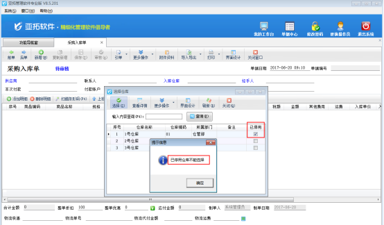 亞拓管理軟件和紅管家倉庫管理軟件都可以對倉庫信息進行管理,如果有些倉庫在單據(jù)中已被使用,系統(tǒng)默認在單據(jù)中已使用過的倉庫信息是不能刪除的(如圖1所示),因為如果刪除,則會影響之前已使用此倉庫信息所開的業(yè)務(wù)單據(jù),對于此種情況,我們可以將需要刪除的倉庫置為停用,已停用的倉庫無法被用于開單。如何把不用的倉庫設(shè)置為停用呢?本篇文章以亞拓管理軟件專業(yè)版為例詳細介紹一下如何