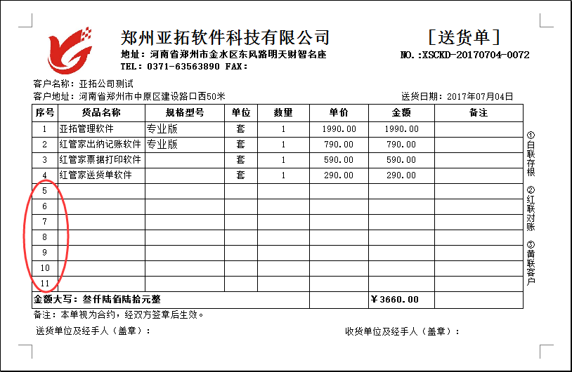 紅管家送貨單軟件、紅管家倉庫管理軟件及亞拓管理軟件等都支持開單打印單據(jù),軟件內(nèi)置了十幾種打印格式模版供客戶選擇使用,同時也支持自定義打印格式模版。一般情況下打印模版設(shè)置自動增加空行時,空白行會不再顯示行號,如下圖一所示,如何設(shè)置才能讓表格一直顯示序號(行號),即使追加的空行也顯示?本篇文章以紅管家送貨單軟件為例來示范一下如何設(shè)置才能讓表格一直顯示序號(行號)。