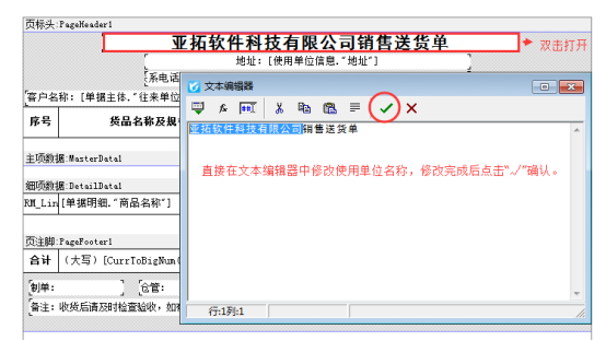 亞拓軟件旗下的紅管家送貨單軟件、亞拓管理軟件、倉庫管理軟件等支持打印單據(jù)。軟件中有內(nèi)置十幾種打印模板。內(nèi)置打印模板的單位名稱自動調(diào)取系統(tǒng)管理中“系統(tǒng)參數(shù)配置”界面的使用單位信息。對于自定義設(shè)計的打印模板,有的客戶是直接在打印模板中輸入的單位名稱。所以需要修改使用單位之前可以先看下打印模板中的調(diào)用數(shù)據(jù)項。