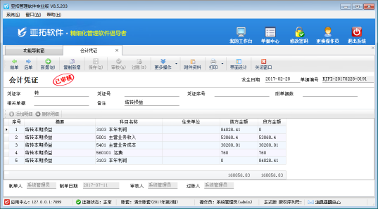亞拓管理軟件專業(yè)版包含的有財務(wù)處理模塊,其中結(jié)轉(zhuǎn)損益是指在期末,將損益類科目的余額全部結(jié)轉(zhuǎn)到“本年利潤”中,并生成相應(yīng)的會計憑證,結(jié)轉(zhuǎn)后,損益類科目余額為零的過程。本篇文章我們來介紹一下結(jié)轉(zhuǎn)損益功能如何使用? 在功能導(dǎo)航窗點擊“財務(wù)處理”—“結(jié)轉(zhuǎn)損益”,即可打開結(jié)轉(zhuǎn)損益窗口。圖一 結(jié)轉(zhuǎn)損益