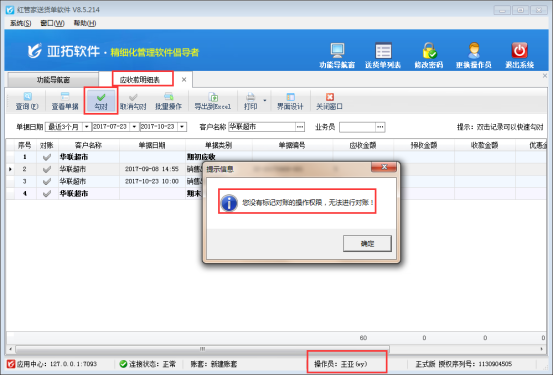 亞拓管理軟件、紅管家送貨單軟件支持管理應收賬,對于已結銷的應收款,可以在應收款明細表中標記對賬。軟件支持設置操作員是否具有對賬權限,以送貨單軟件為例,示范下如何控制操作員的應收款對賬權限。 在功能導航窗,點擊“操作員管理及授權”,進入操作員管理及授權頁面,選擇需要設置的操作員“王亞”(系統管理員默認具