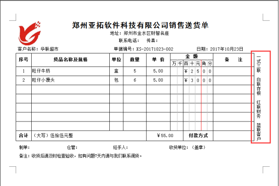 亞拓管理軟件、紅管家送貨單軟件、紅管家倉庫管理軟件都支持設置自定義打印模板,比如:三聯單打印模板,三聯單打印模板需要在右側顯示出每聯單的保存作用,以“一式三聯 白聯存根 紅聯財務 藍聯客戶”為例,示范下如何在三聯單打印模板中添加此字樣。 在紅管家送貨單軟件中,在功能導航窗選擇“業務處理”—》“新開送貨