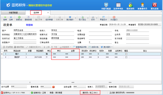 信管飛送貨單軟件(原“紅管家送貨單軟件”)支持多個操作員登錄使用軟件,可以對不同的操作員設置不同的權限。有些客戶不允許操作員查看商品銷售價,軟件支持在“操作員管理及授權”中設置操作員不能查看銷售價格,下面我們詳細介紹一下操作員不可查看商品銷售價的設置方法。 登錄信管飛送貨單軟件,在功能導航窗點擊“系統管理”—》“操作員及授權