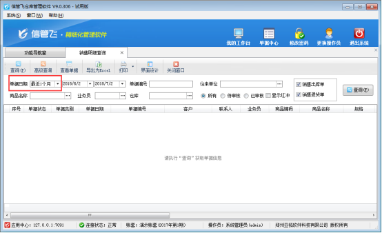 信管飛倉(cāng)庫(kù)管理軟件、信管飛RMS軟件等軟件內(nèi)都包含統(tǒng)計(jì)查詢功能(采購(gòu)單列表、銷售單列表、采購(gòu)單明細(xì)查詢、銷售單明細(xì)查詢等統(tǒng)計(jì)查詢報(bào)表),軟件內(nèi)統(tǒng)計(jì)查詢報(bào)表默認(rèn)查詢?nèi)掌谑恰白罱?天”如下圖1所示,如需要修改默認(rèn)查詢?nèi)掌冢撊绾涡薷哪兀肯逻呉浴靶殴茱w倉(cāng)庫(kù)軟件軟件”為例示范如何修改默認(rèn)查詢?nèi)掌凇?nbsp;圖1 銷售明細(xì)查詢界面 &