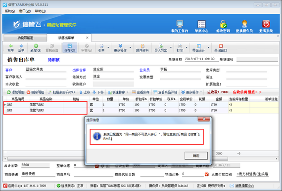 信管飛送貨單軟件、信管飛倉(cāng)庫(kù)管理軟件、信管飛RMS等軟件在新開(kāi)業(yè)務(wù)單據(jù)時(shí)默認(rèn)在一個(gè)單據(jù)單據(jù)明細(xì)內(nèi)支持同一商品可添加多條記錄(如下圖一所示),部分用戶在開(kāi)單時(shí)需要設(shè)置在單據(jù)明細(xì)中同一商品不可錄入多行?該如何設(shè)置呢?本篇文章我們以信管飛RMS為例來(lái)介紹一下如何設(shè)置開(kāi)單時(shí)單據(jù)明細(xì)中同一商品不可錄入多行。圖一 銷售出庫(kù)單界面 在功能