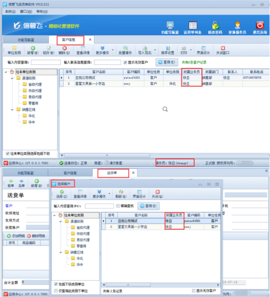信管飛RMS軟件、信管飛倉(cāng)庫(kù)管理軟件、信管飛送貨單軟件等都支持設(shè)置操作員權(quán)限,以控制操作員登錄軟件所顯示的功能,如公司需要限定操作員僅能查看和選擇自己所屬客戶信息,軟件中可以進(jìn)行控制。 以“信管飛送貨單軟件”為例,示范下如何控制操作員僅能查看所屬為自己的客戶信息。首先需要在客戶信息中進(jìn)行整理下客戶的所